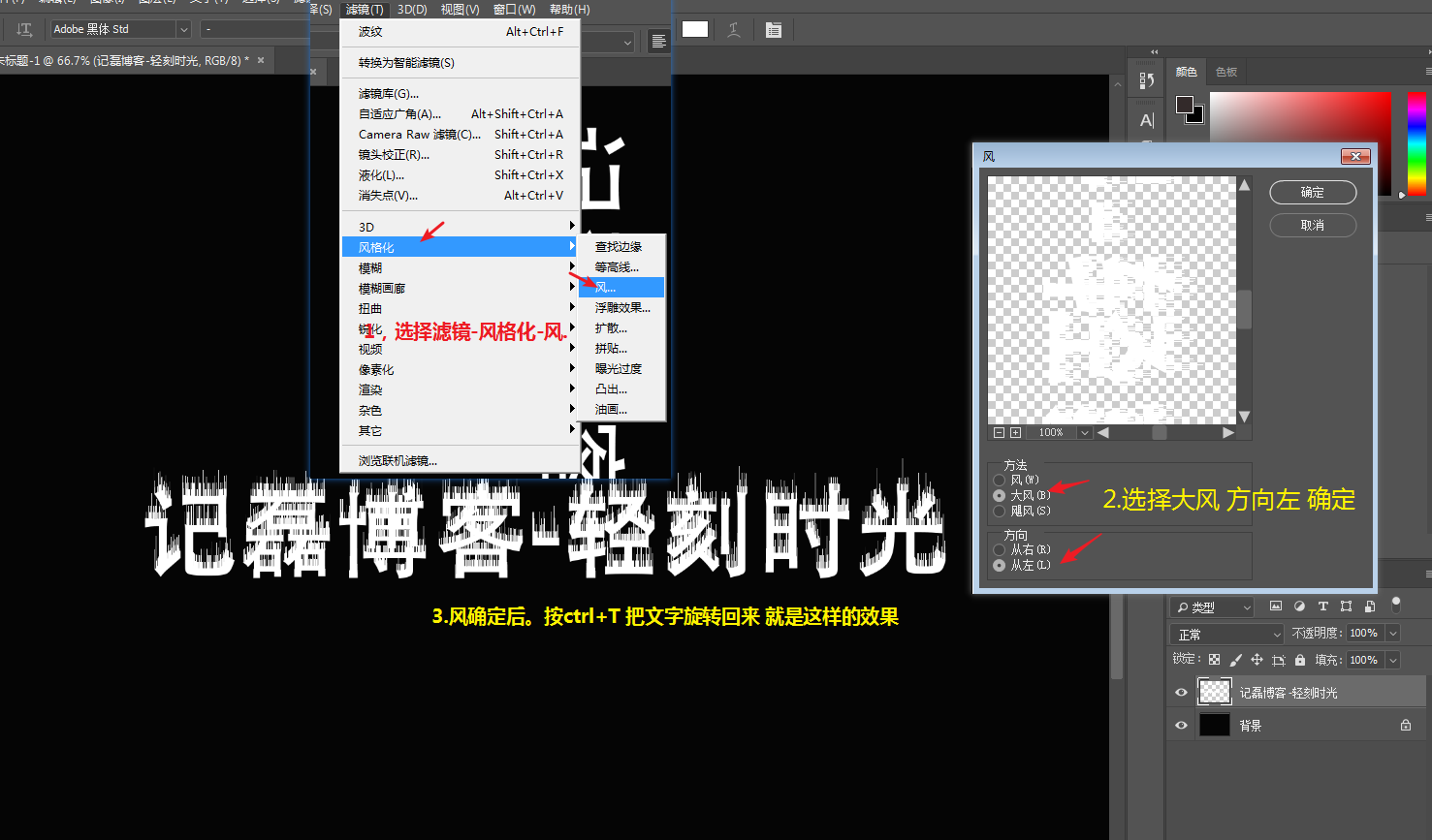 风设置:大风 方向左 确定 然后把文字Ctrl+T右键选择旋转回来(旋转回来按下回车确定下)